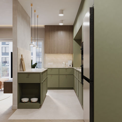Projekt wnętrza oparty na neutralnej, beżowej bazie i ciepłym odcieniu drewna tworzy spokojne, harmonijne tło dla starannie dobranych kolorystycznych akcentów. W każdym z pomieszczeń pojawia się inny, wyróżniający się kolor. Równowaga między stonowaną bazą a indywidualnym charakterem każdego pomieszczenia sprawia, że całość jest spójna, a jednocześnie pełna wyrazu.